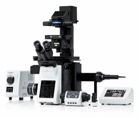 IXplore tutkimuskäänteismikroskooppisarja Alkaen IX73 manuaali IXplore standardi käänteismikroskooppista aina IX83 täysmotorisoituun Super resoluutio spinning disk konfokaaliin IXplore SpinSR. Olympus IX73:n modulaarinen manuaalinen käänteistutkimusmikroskooppi. Valittavissa manuaalisin koodatuin komponentein tai osittain motorisoituna. Tehokas LED valo mahdollistaa kaikki kontrastimenetelmät: kirkaskenttä, faasi, DIC. Fluoresenssi kahdeksalla filtteripaikalla manuaalisena tai motorisoituna.